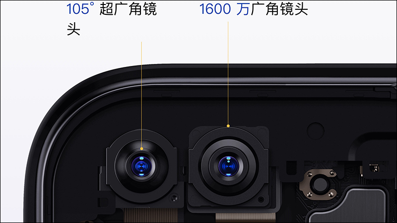 前相機方面,配備 1,600 萬畫素 F2.0 光圈搭配 800 萬畫素 105° 超廣角 F2.2 光圈雙鏡頭:
