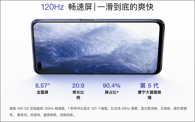 realme X50 配備 6.57 吋 20:9 修長比例、 Full HD+ 解析度(2400×1080 )的挖孔全螢幕,螢幕佔比達 90.4% 。螢幕也支援 120Hz 螢幕更新率,能有流暢的使用體驗: