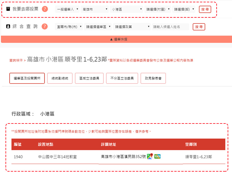 打開網站後你就可以直接看到最上方「我要去哪投票」的欄位,在這裡填寫好你的選舉人身分、戶籍地址(最多到鄰),然後就可以按下搜尋按鈕,接下來的頁面上即會顯示你該去的投票所。