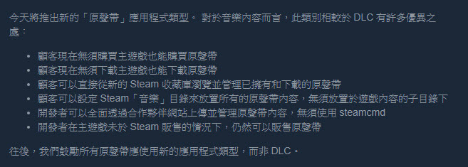 Valve官方公告指出,Steam 上原本並沒有「原聲帶」的應用程式類型,因此過去都是以最接近的「DLC」 形式來販售,但卻逐漸變成既有的原聲帶無法與大量的 DLC 專用功能分開,而且往往須先行購買或下載主遊戲,才能購買或下載遊戲原聲帶。