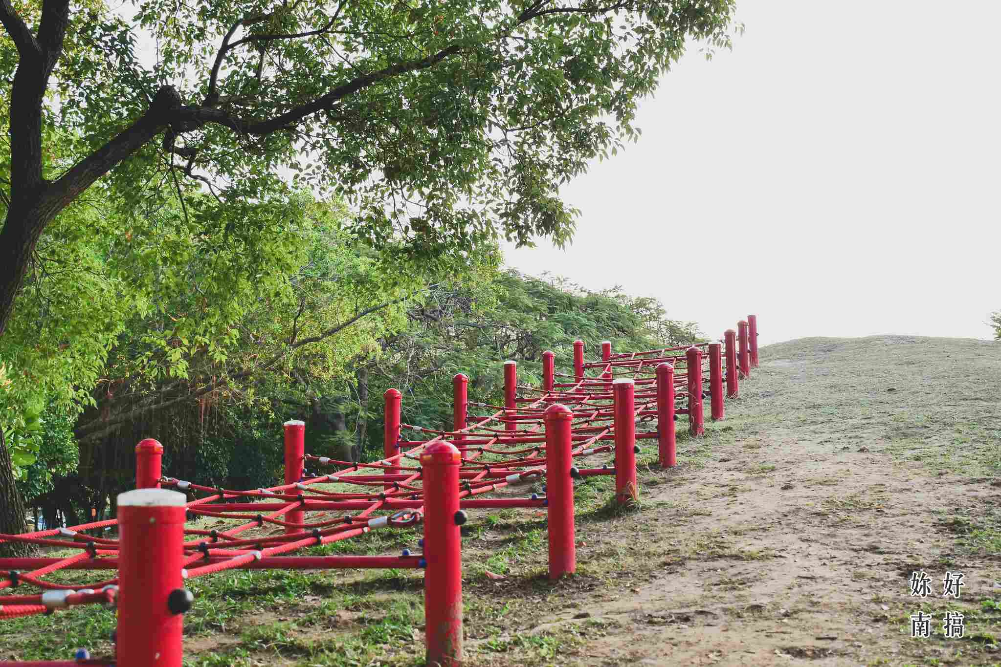 明和公園,為台南第一座地景式遊樂公園,運用公園內高低錯綜的小山丘,打造出與環境和諧共融的遊樂設施!這片寬敞的草皮上,有攀爬網、單人滑索、兒童遊戲區以及水管溜滑梯。攀爬網設計在斜坡上,分紅色與綠色兩座,給愛攀繩的小朋友帶來挑戰的快感。兒童遊戲區五花八門,也貼心設置遮陽隔幕,日正當中也不怕。