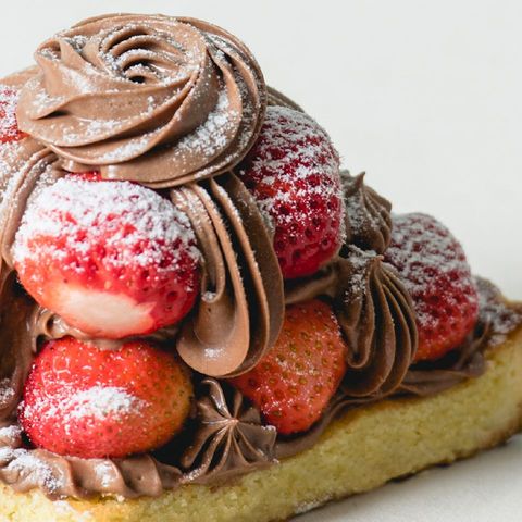 讓人難以抗拒的巧克力卡士達配上堆成山的完整草莓絕對是幸福代名詞!多汁酸甜的大草莓為卡士達解膩,吃起來實在太過癮!