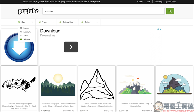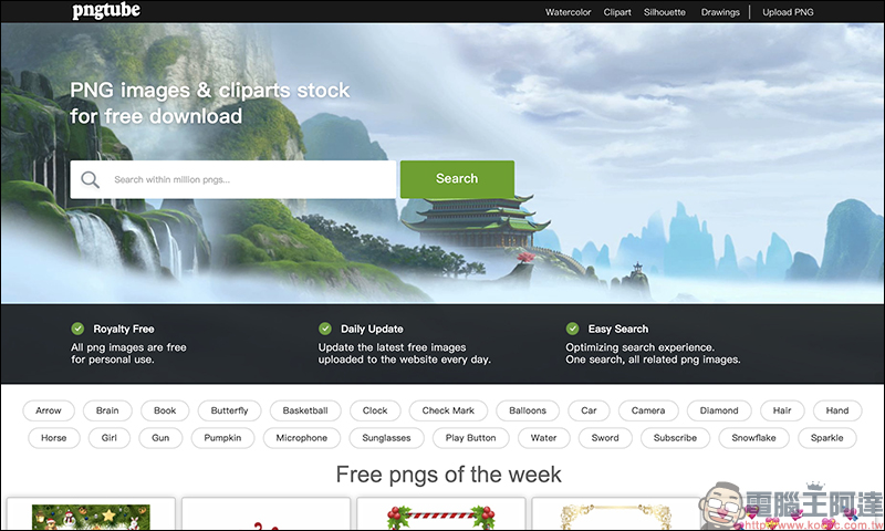 在 Pngtube 這個免費去背圖庫網站,收錄了超過 5 萬個類別、百萬張透明背景的 PNG 圖檔供民眾下載使用。在 Pngtube 主頁面,除了顯示熱門的數十種分類外,用戶也能透過搜尋功能輸入想找的圖片關鍵字來查詢圖片。不過要特別留意,所有在 Pngtube 的圖檔雖然都可以免費下載,也不需要註冊帳號或輸入認證碼,但僅供個人使用或非商業用途使用: