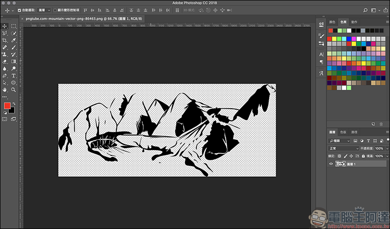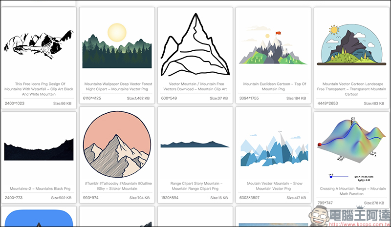 以筆者下載的這張山脈的圖片為例,在圖片的背景皆為透明的 PNG 圖檔。因此能直接應用在 Photoshop 、 Illustrator 等影像處理軟體進行影像合成等創作: