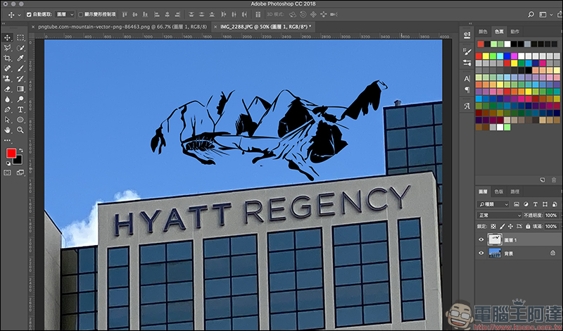 例如將山脈合成在大樓上方: