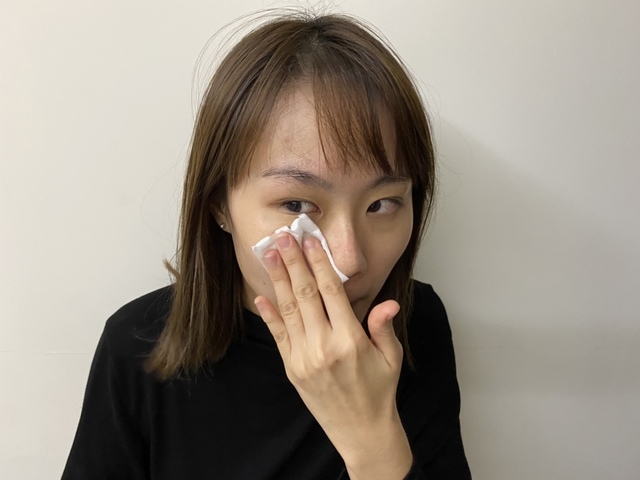 針對全臉的底妝,可以按壓適量卸妝液於掌心,以指腹按摩畫圓後擦拭