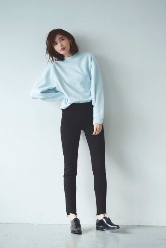 如果是窄身牛仔褲的話,上衣要選鬆身款,,這樣比例上看起來,下半身非常顯瘦。而且最好是上身淺色,下身深色,這樣就更能做成視覺上的錯覺,顯得雙腳更修長。