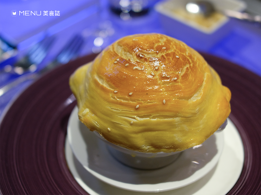 服務生會貼心提醒上方的螺旋酥皮可以趁熱撥下,脆皮的部分可以放在碗旁,用濃湯沾取海鮮濃湯食用。