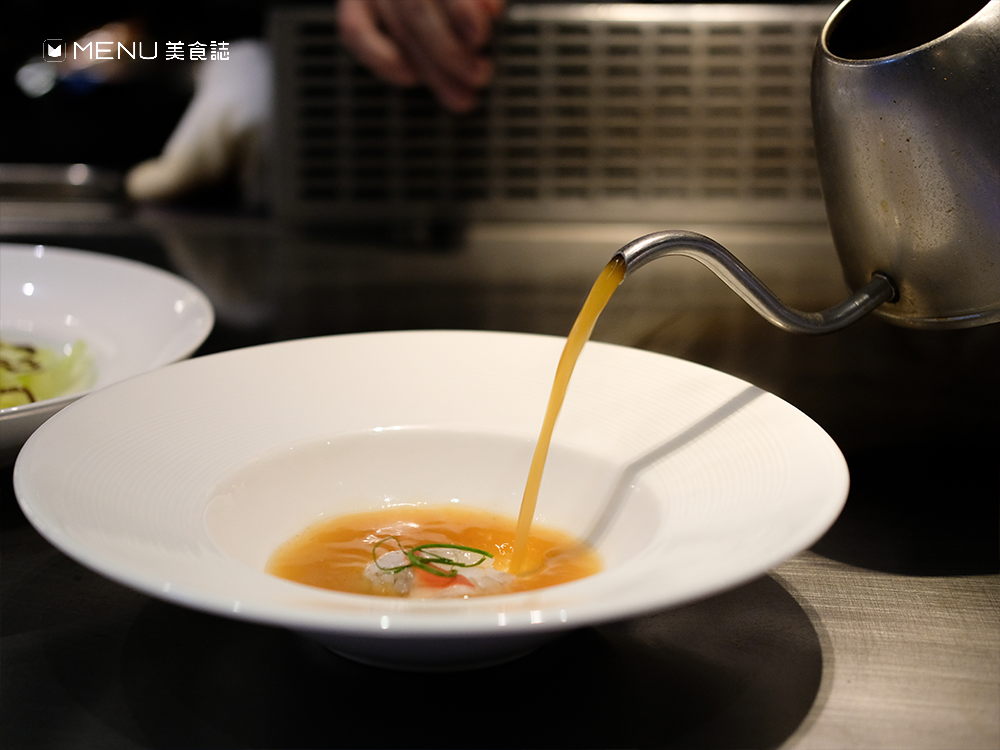 先於碗中放入鮮蝦、花枝及蘭花蚌,師傅會在我們面前倒入現煮的海鮮高湯。