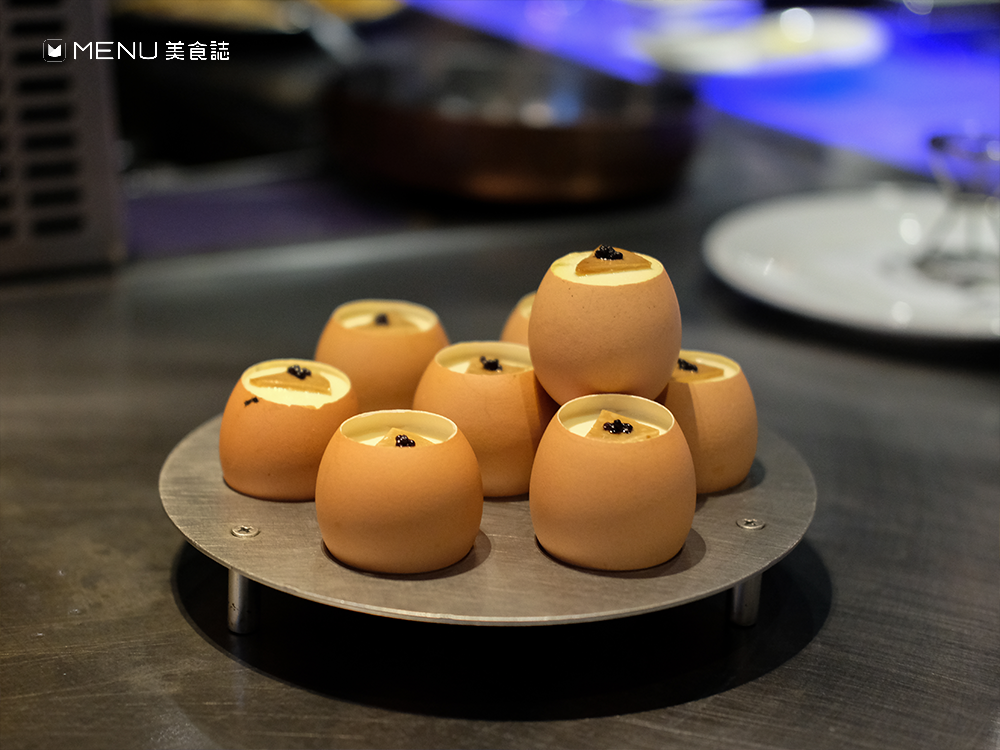 一人可以拿到一個蛋盅,利用整顆蛋殼包覆著裡面的蒸蛋,最底部加入松露醬汁,再放上鵝肝及魚子醬,吃起來非常濃郁順口,吃完還想再吃一個!