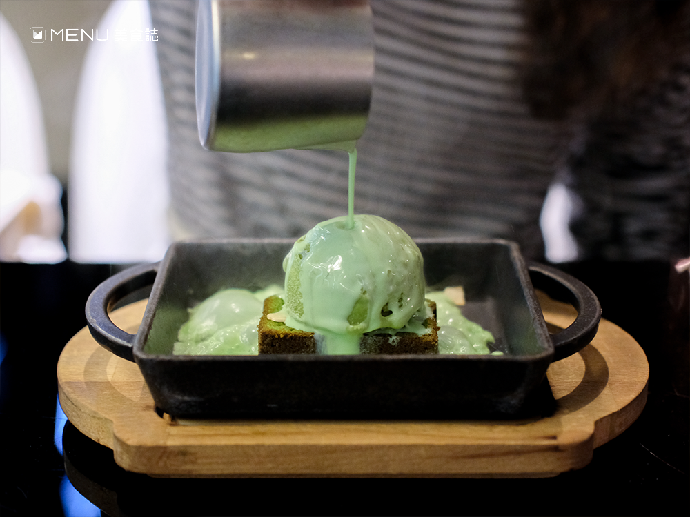 送上來會是滾燙的鐵板熱蛋糕,上面會放上一球抹茶冰淇淋。