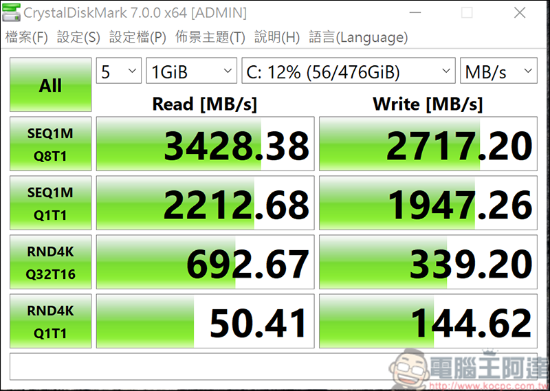 使用CrystalDiskMark 測試讀寫,測得3428MB/S讀取,2717MB/S寫入 :