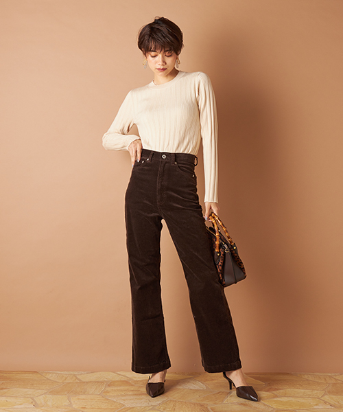 基本款的咖啡色燈芯絨長褲,不論是淺或深的咖啡色調都能使衣著營造成熟穩重的氣質,選搭針織款的合身坑條上衣、小高領毛衣等,運用杏 + 咖的造型組合傳達輕復古的冬季 Look。