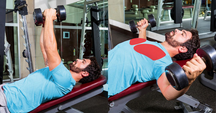 如何做:手握啞鈴躺於長凳上,掌心相對,挺胸收背。向外張開手臂,手肘微微彎曲,一直往下到手肘稍微低於背部,再將重量往上提,夾緊啞鈴。