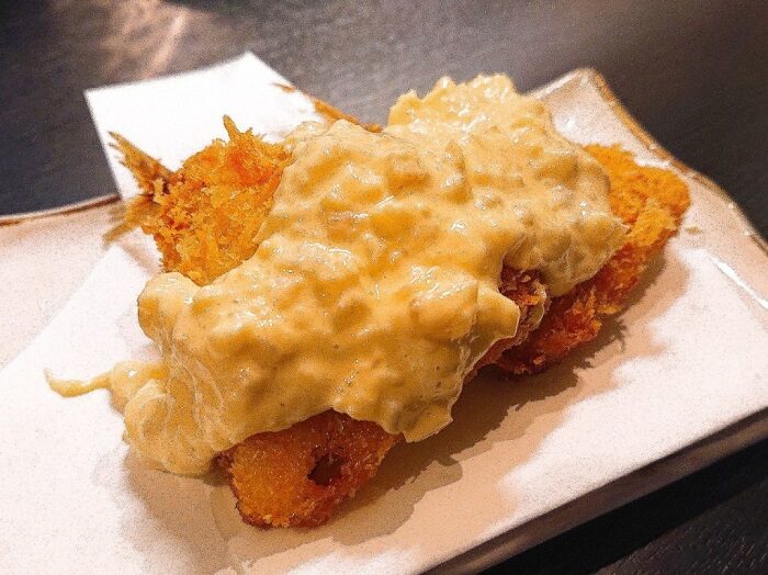 看上去是普通的炸竹筴魚,秘密武器是淋在上方的特製塔塔醬喔!加入醃蘿蔔和小芋頭等食材製作出來的塔塔醬,吃起來脆脆的很有嚼勁,配上小芋頭的黏性,創造出特有的絕妙口感。竹筴魚本身份量也很大方,且炸得酥酥脆脆,能享用到這樣的平價料理實在令人讚賞。