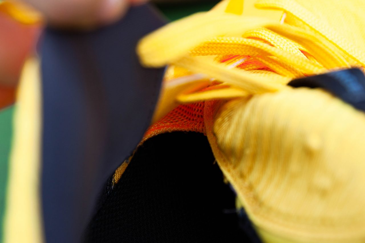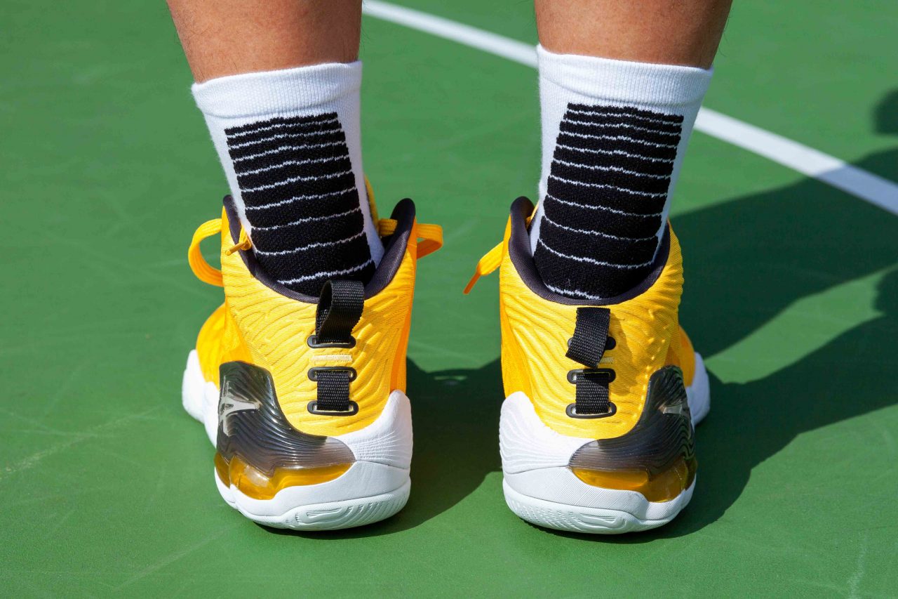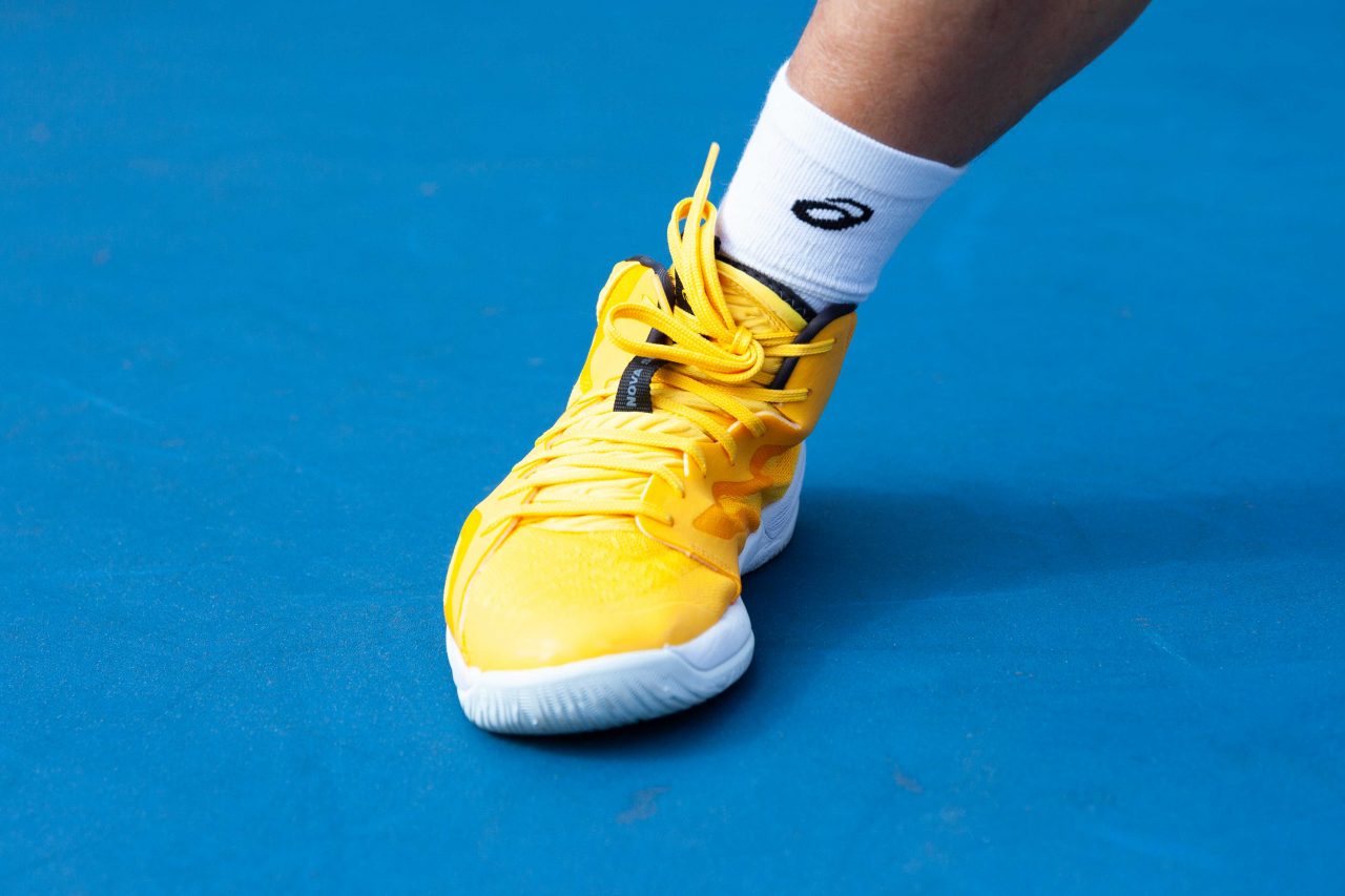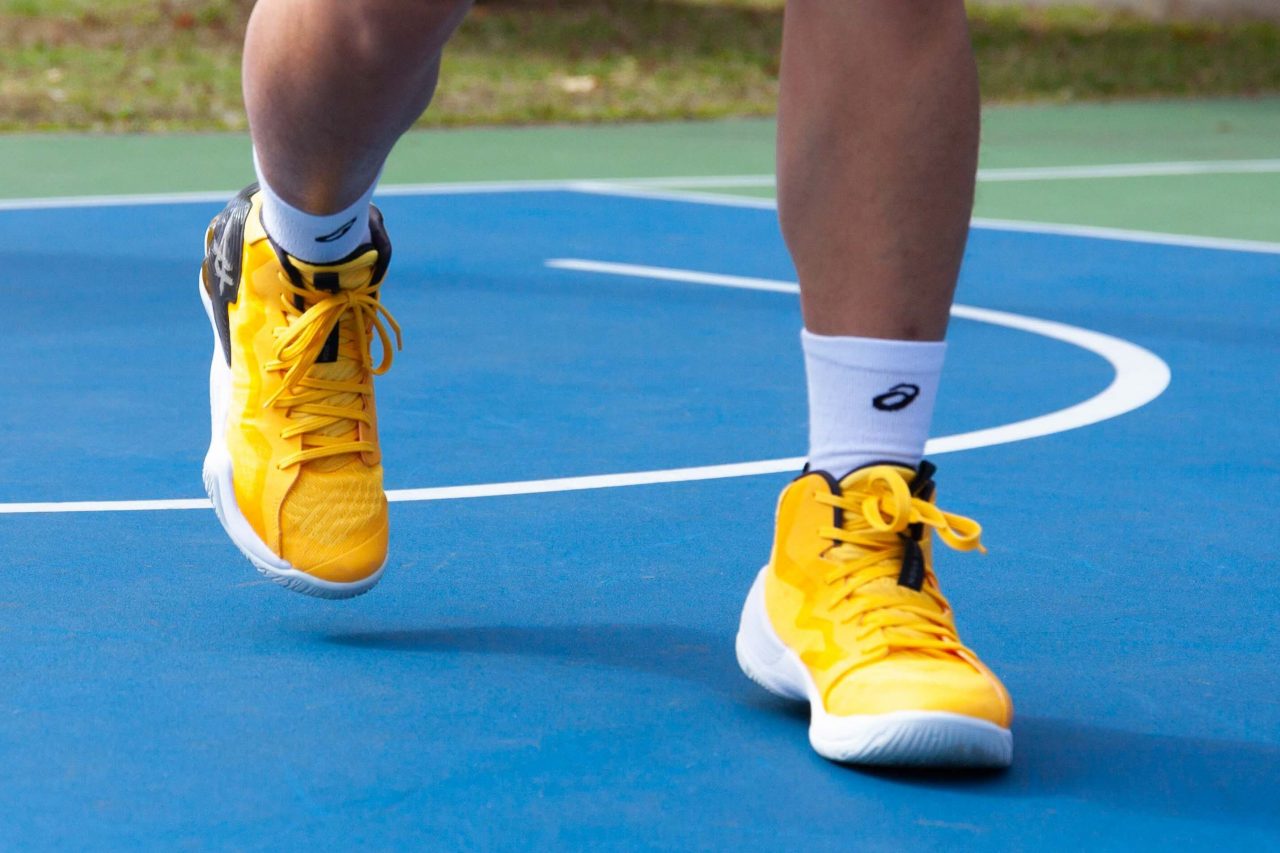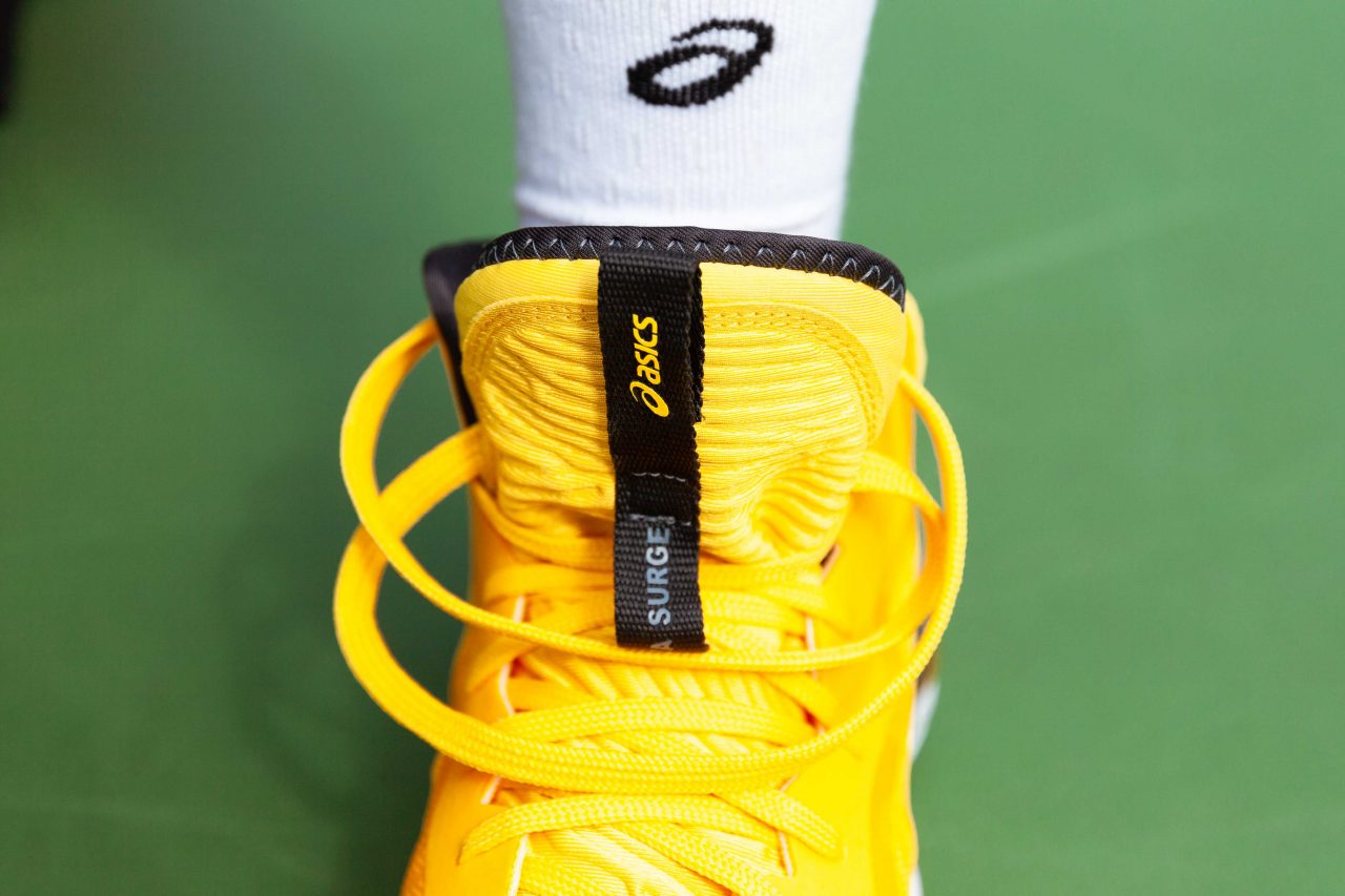 前幾張照片裡可能有些勘履者已注意到,鞋舌是呈現歪斜狀態,確實鞋舌容易左右移動但打球時影響不大,為什麼我認為不妨礙穿著呢?首先 NOVA SURGE 使用半內靴式設計,下半部與鞋身內層彈性面料相接合,所以位移幅度有限,再來是 NOVA SURGE 鞋舌本身挺寬,所以即使偏離中軸腳背依然被好好覆蓋著,未超出鞋舌可包覆面積,因此並無卡卡不舒服,編輯其實是在場邊休息期間才發現鞋舌歪了,下意識還是會順手拉正,但穿著感幾乎無異。如果很在意或者你會不舒服,可以把鞋帶穿過拉環 (印有 ASICS 字樣那邊) 後再繫緊打結,情況便能有效得到改善。