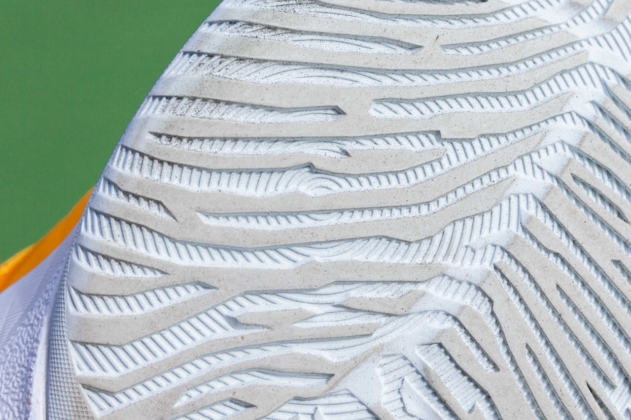NOVA SURGE 外底還有一個不得不提的是,紋路似乎有兩層?!我剛開始穿沒注意到,拍攝鞋評照片時細看才發現底部佈有數十道弧線,編輯猜想可能是要作為適時補上抓地力的保險,畢竟正常使用下一定會有某些區域較常接觸地面 (視每個人打法、走路習慣而不同),當這些區域慢慢磨成平滑面而其餘紋路依然存在,這時候就輪到底層弧線頂替上陣,讓磨耗較快的部份不致於完全失去抓地效果,延長鞋款退役時間。編輯蠻期待未來當不規則紋路消耗完,弧線是否真如我所想能發揮作用。