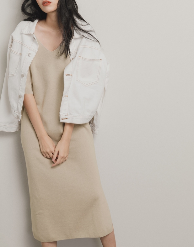 V領綁帶側開岔針織長洋裝