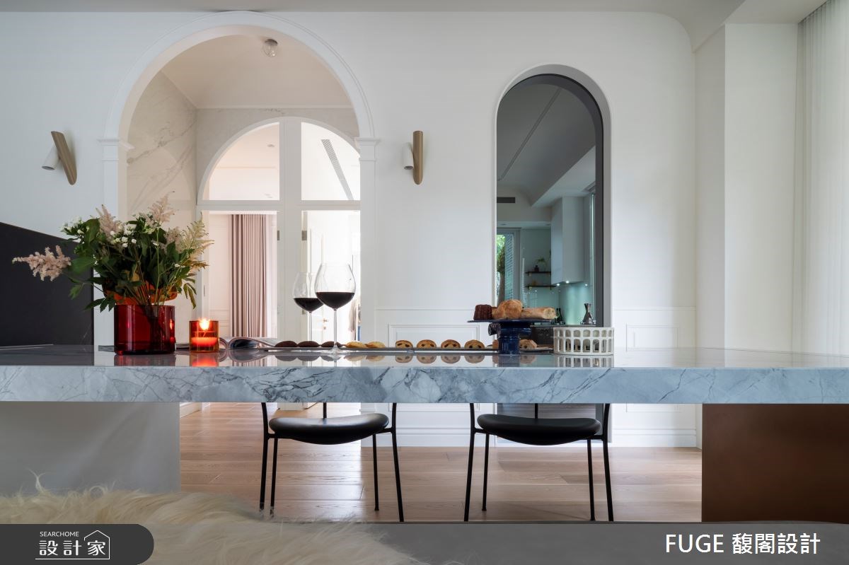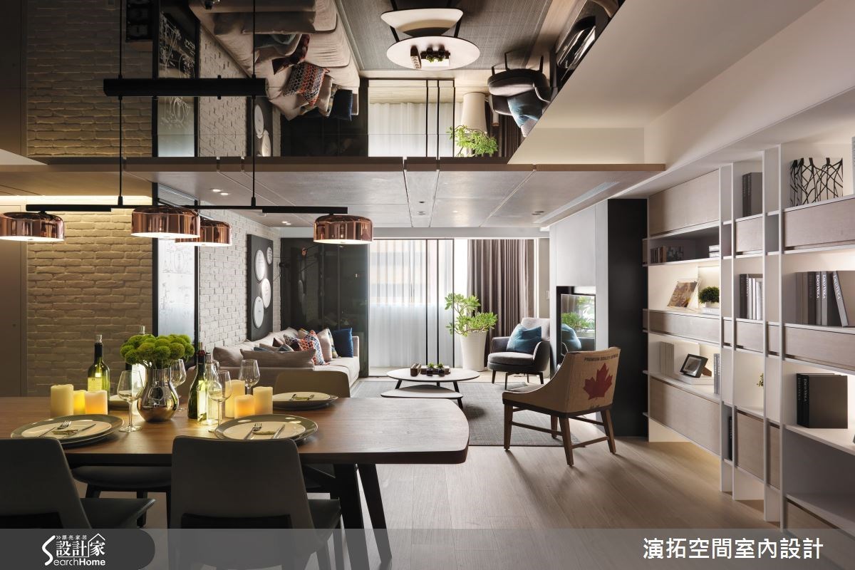 另外,鏡面的功用並不只局限於鏡子,舉凡鍍鈦、黃銅金屬、灰玻黑玻等能夠反射空間的材質都能有同樣的效果。而於室內設計中,鏡面也不是只局限在牆面上,在天花板加入反射的鏡面材質能夠替空間帶來更多變化,縱向延伸空間高度,不僅達到另一種放大空間的效果,還能帶來新的視覺體驗,翻玩設計視角!
