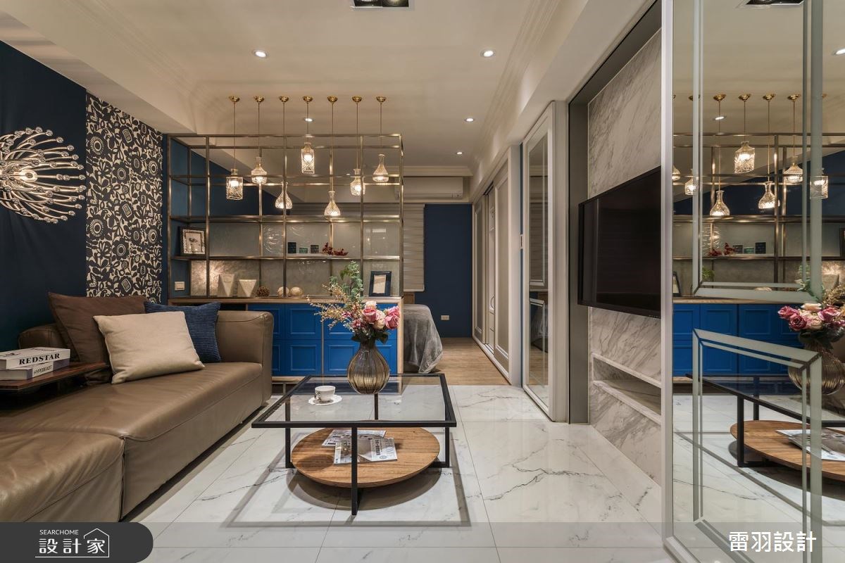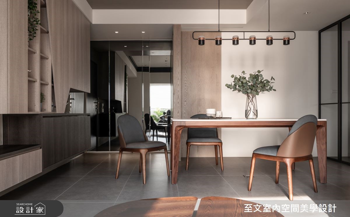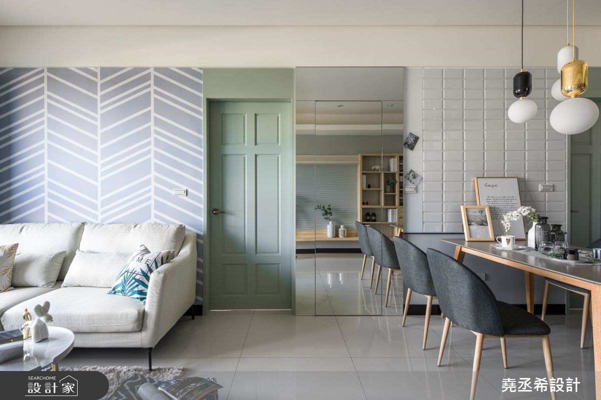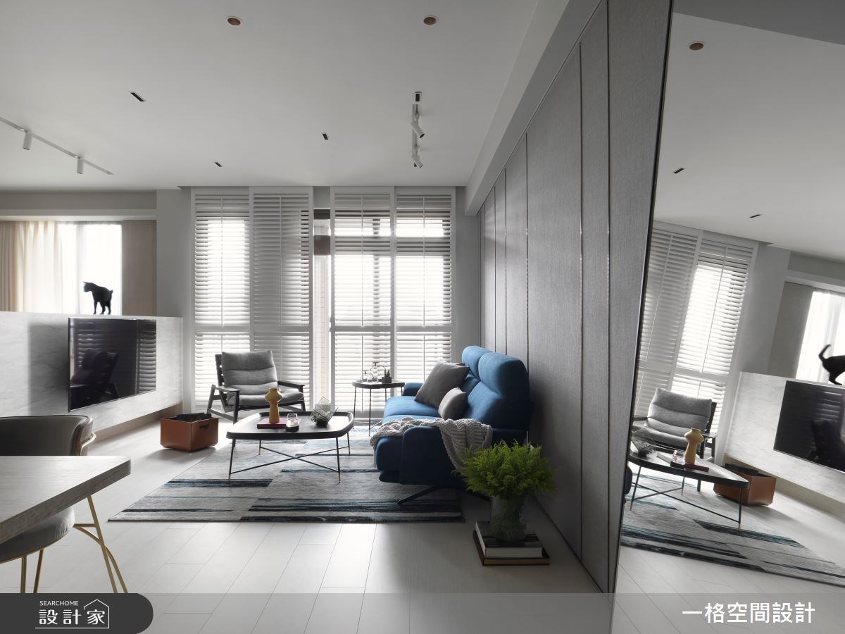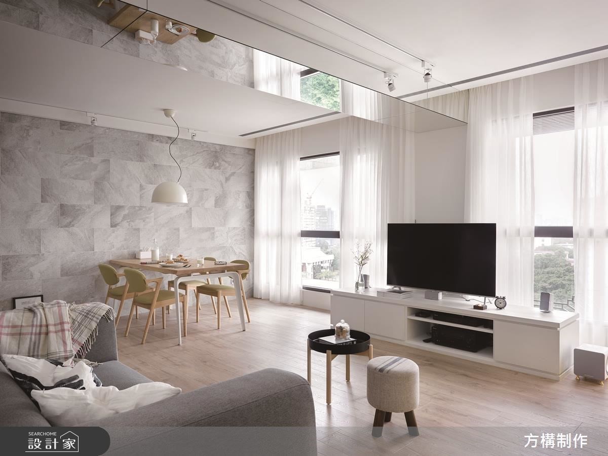 客廳是居家生活的重要場域,設計師在配比上也會盡可能放大公共區域,但在中、小坪住宅裡,鏡子的存在就成了放大空間的魔術師。鏡子鑲嵌於牆面形塑造型電視牆,也能用來隱藏門片營造空間整體感,發揮鏡面反射的特性化解空間深度不足帶來的壓迫感。
