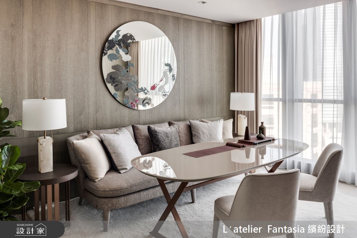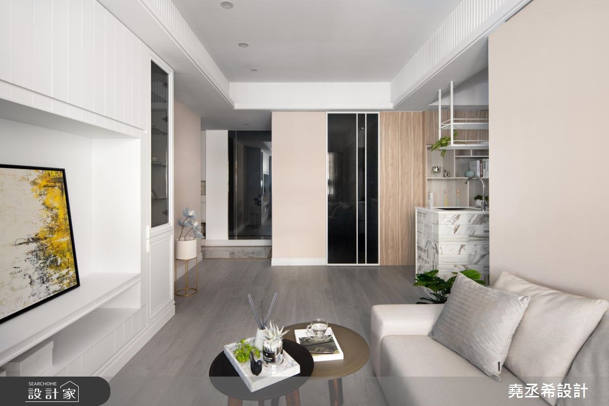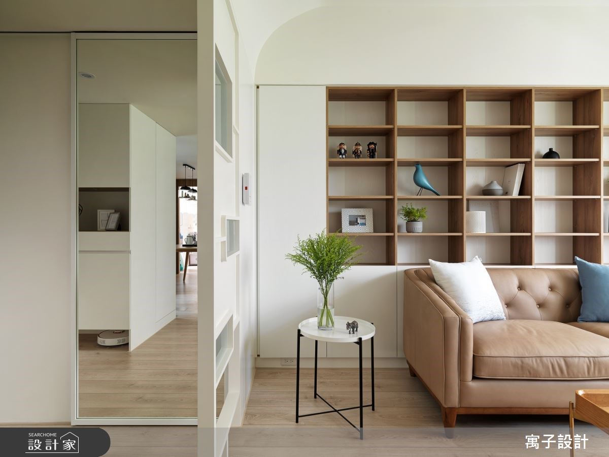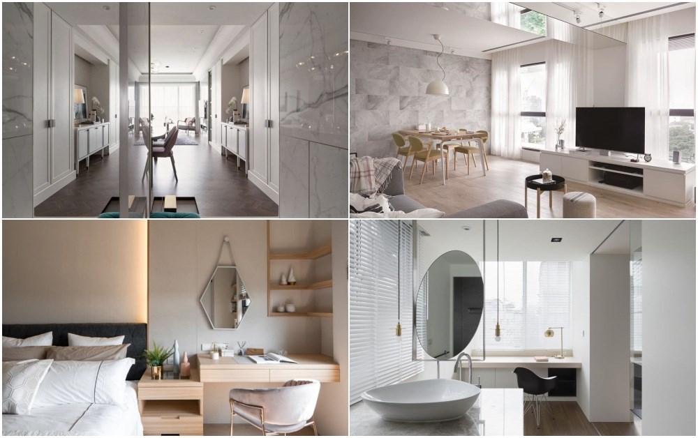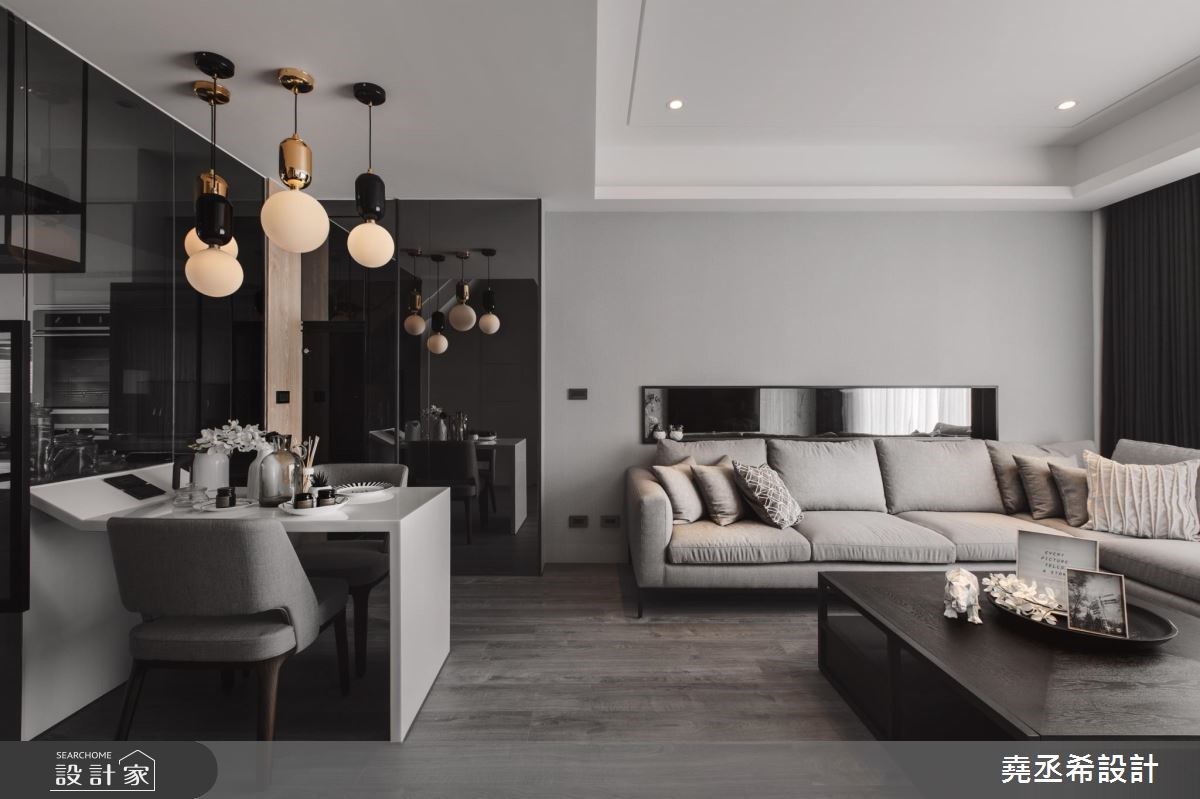 客廳是居家生活的重要場域,設計師在配比上也會盡可能放大公共區域,但在中、小坪住宅裡,鏡子的存在就成了放大空間的魔術師。鏡子鑲嵌於牆面形塑造型電視牆,也能用來隱藏門片營造空間整體感,發揮鏡面反射的特性化解空間深度不足帶來的壓迫感。