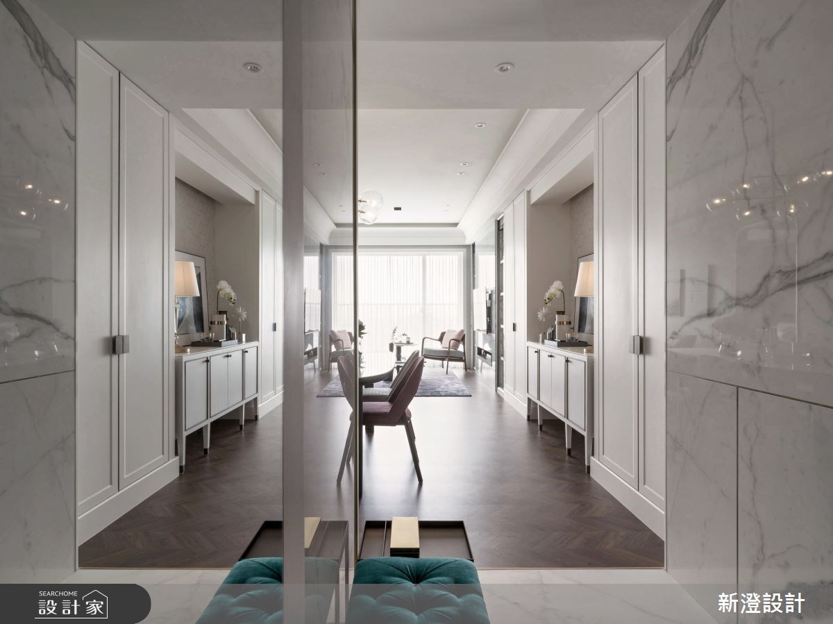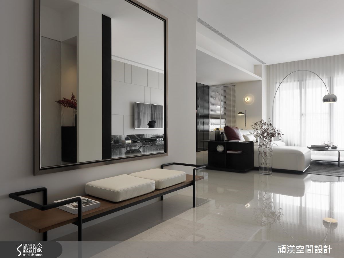 另外,玄關鏡也能在門口就反射居家空間,創造空間層次感,倒映出空間景深,當然對小坪數來說也能在視覺上營造比實際坪數更寬敞的感受。透過不同的鏡面大小、形狀與擺放位置,決定反射出室內空間的全貌或局部,從玄關鏡設計打造耐人尋味的空間趣味。