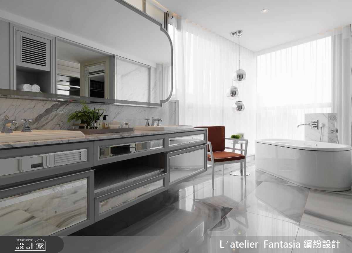 說到居家空間裡必有鏡子的地方絕對是浴室!浴室裡的鏡面雖然是以機能面考量設計在洗手台牆面為主,但其實浴室內的鏡子還身負其他重任。一般來說浴室坪數約1.5-2坪,客浴甚至更小,這時候鏡子就會發揮他的功效,透過鏡面反射延伸視覺,舒緩小空間帶來的壓迫感;有些能映照出窗景讓視野更遼闊。