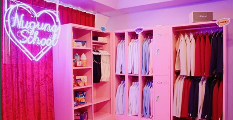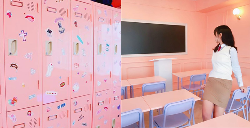 整裝完畢後,可以先選擇在他們的店內場景區拍照,裡面是超可愛的教室造型,隨便一個角落都充滿了粉紅泡泡,有掛滿制服的粉色衣櫃,粉嫩的課桌椅,今天的你,是乖巧的班長還是愛睡覺的迷糊學生呢?在這裡,絕對可以秒殺手機記憶體沒問題!