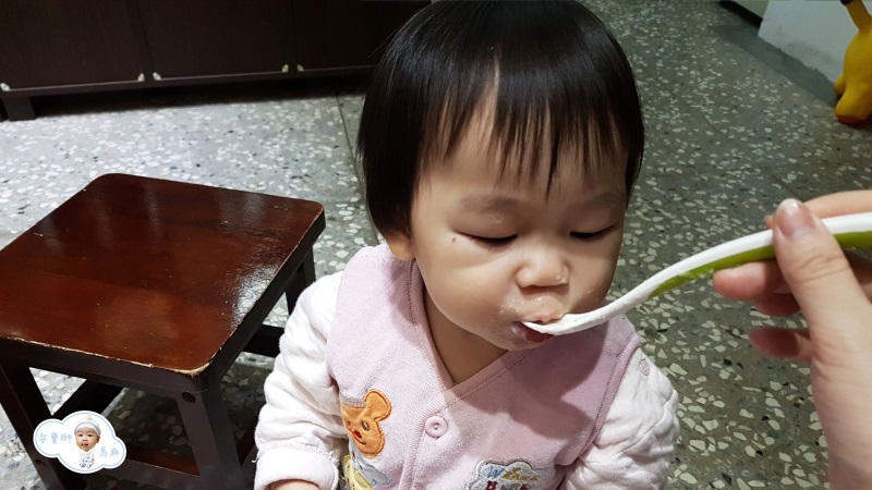 安寶獅吃一半之後就開始調皮,所以馬麻的方法是,加幾顆新鮮的藍莓在有機胚芽米精裡(她很喜歡吃藍莓),然後她會吃的很開心,把剩下的米精吃光光。很難得可以補捉到她吃到酸的藍莓的表情,超有喜感,可愛~呵呵呵。(自己生的都覺得特別可愛)