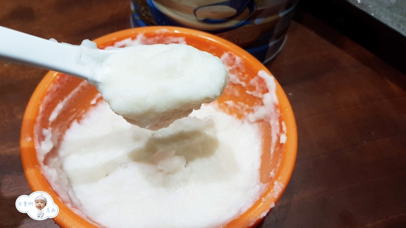 金愛斯佳有機胚芽米精的比例是1湯匙米精加30cc水,沖泡時快速溶解,米糊非常綿密,吃起來有點像馬鈴薯泥的口感,淡淡的清香。(因為看起來很好吃,所以馬麻有偷嘗一下。)