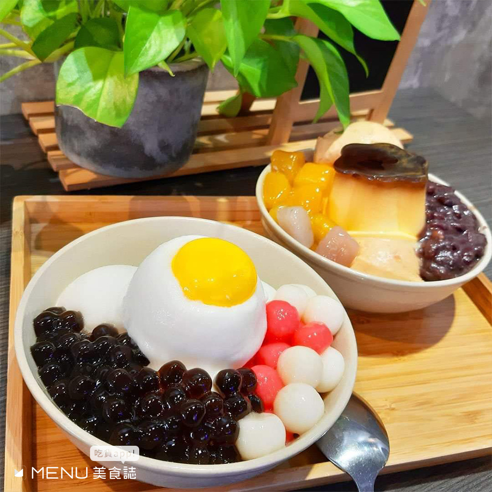 文青系冰店,這裡的冰品可以自由選擇冰底口味和喜歡的配料。「招牌什麼冰」冰底是香檳牛奶綿綿冰,口感綿密、入口即化,再加上QQ珍珠、湯圓,最上面再打上一顆蛋黃,雞蛋牛奶冰的味道很香濃涮嘴。