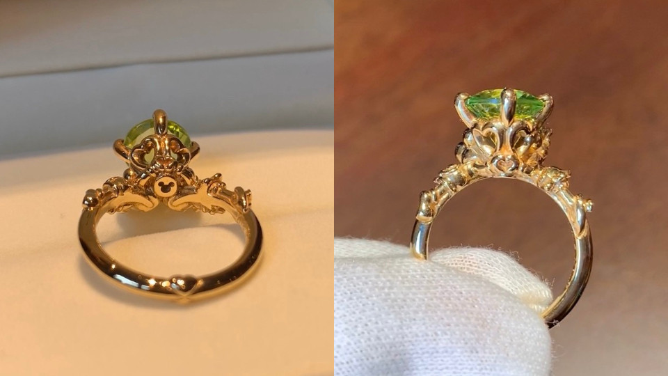 詢問度超高的寶石戒指,使用立體造型的米奇米妮,以環抱形式圍繞著寶石,細看戒指背面,他們還用雙手拼成愛心形狀,小巧思令人喜愛不已,此外寶石底部還雕刻米奇頭像圖騰,戒圈部分也藏有立體愛心,除了最受歡迎的粉寶石,根據不同店鋪也有不同顏色的寶石。