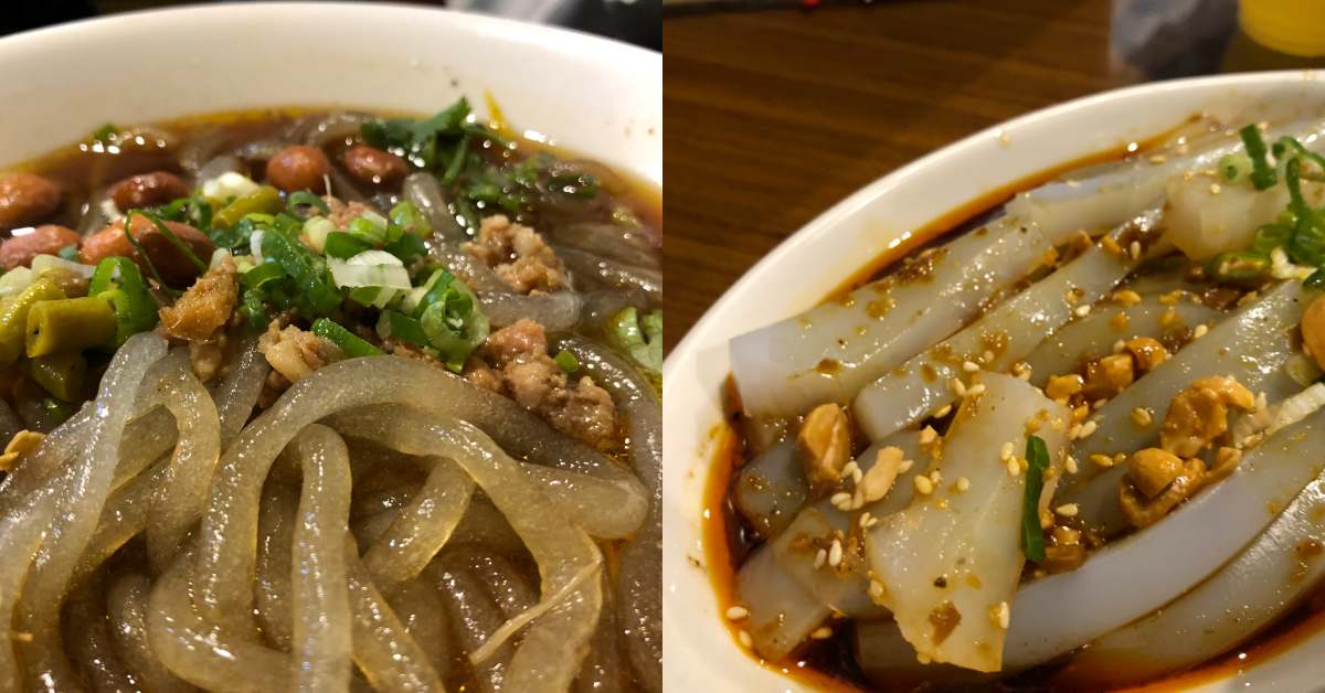 (左)重慶手工酸辣粉 $95元,手工酸辣粉吃起來很像冬粉的10倍粗的口感,非常的Q彈不會一咬就爛,湯底口味不是像台式酸辣的有濃厚的胡椒味,反而是比較多花椒之類的辛香料味道,最後重慶四川菜一定會灑上招牌的花生與肉末!(右)川北涼粉 $60元,這道涼粉吃起來有點像綠豆粿或是粉粿的味道,感覺會比較適合甜食,口感比起酸辣粉也會比較沒這麼Q,不過冰冰涼涼的吃下肚真的很開胃!非常適合夏天吃不下飯的時候吃。