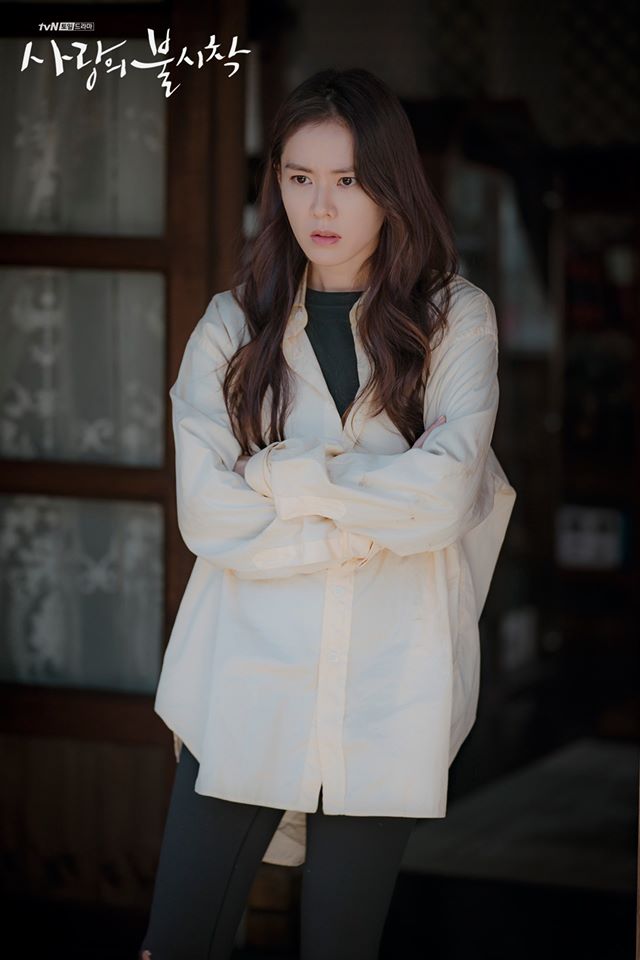 由於劇中這對情侶有大量外出、踏青行程,所以許多搭配都以「有造型感但不複雜」為最高指導原則。延續大地色給人的仿舊感,代入絕不會出錯的復古風和學院風裡面。孫藝珍換上寬鬆的奶茶色短毛衣和淺灰色荷葉立領上衣,下半身選搭黑色百褶裙、內搭褲和皮靴,其實適時地將彩度降低,反而能讓整體造型更耐看!