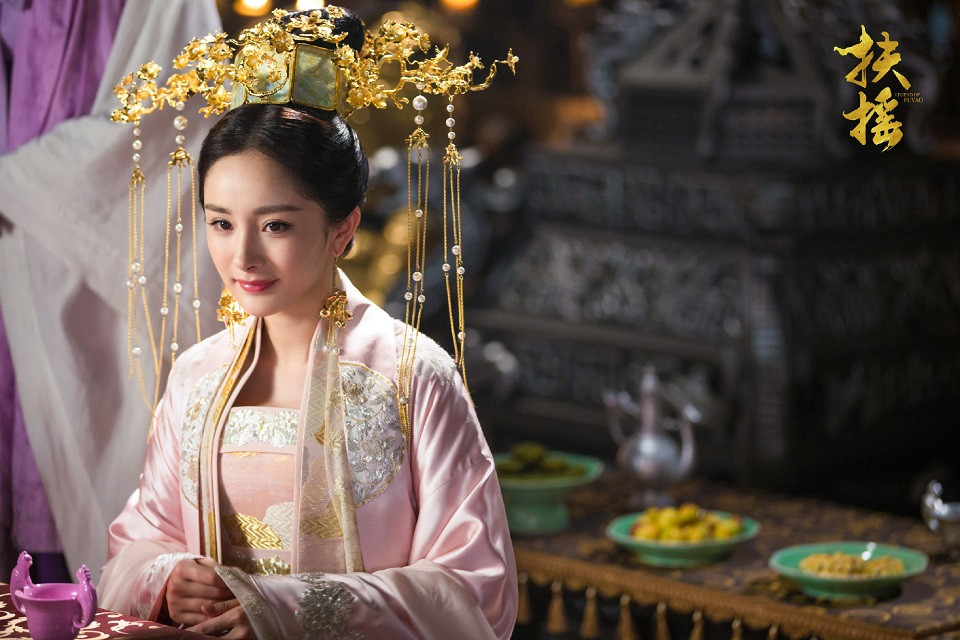 楊冪在《扶搖》的嬪妃造型也讓人印象深刻,她在這部劇大部分都是帥氣的俠女造型,很少穿得華麗,扮成嬪妃時頭上頂著巨大的水晶燈,其實滿美的,但應該頗重。