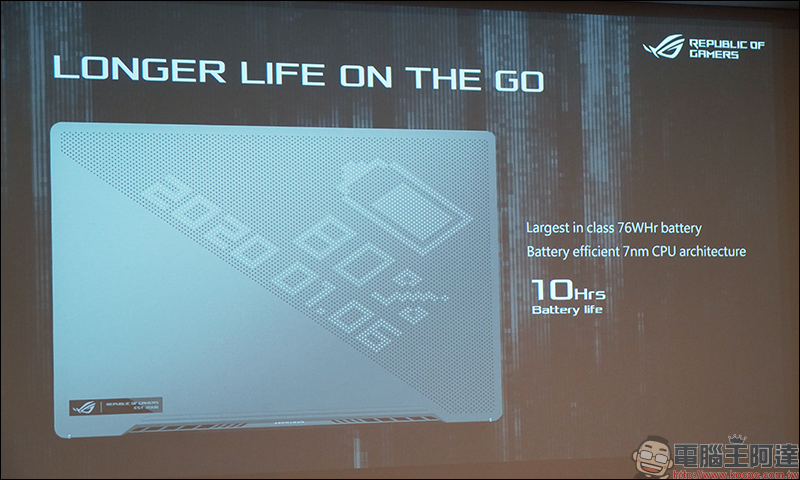 續航方面, ROG Zephyrus G14 內建 76WHr 電池,並支援最長 10 小時續航表現: