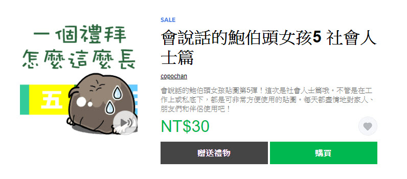 「慰勞社畜們 指定貼圖5折」,從2020.01.17 10:00 ~ 2020.01.20 23:59,指定10款貼圖全面5折,皆為30元。