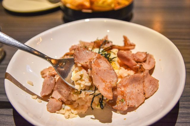工作人員建議我們一口松阪豬肉配上一口飯,松阪豬吃完之後,再將半熟蛋劃開將蛋液完整的與燉飯攪拌,讓整個燉飯更濃郁香濃~