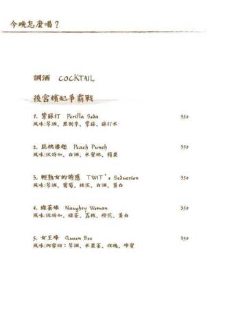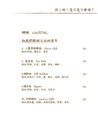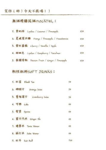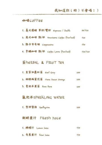酒單則提供Cocktail調酒、紅/白酒、啤酒、威士忌、高濃度的Shot;無酒精的雞尾酒、咖啡、茶、氣泡水、軟性飲料,選擇相當豐富(酒單及菜單在文末)