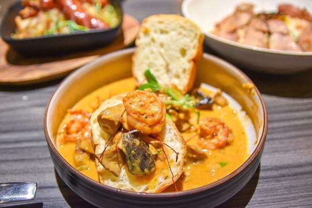 把蝦仁與蘑菇和醬汁加到麵包上,香濃的醬汁流瀉到酥脆的麵包裡,真的太好吃啦!