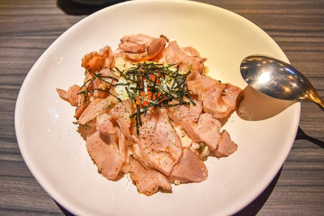 燉飯因為加入了明太子拌炒而呈現漂亮的粉橘色,再撒上魚卵、海帶絲,風味獨到相當特別~