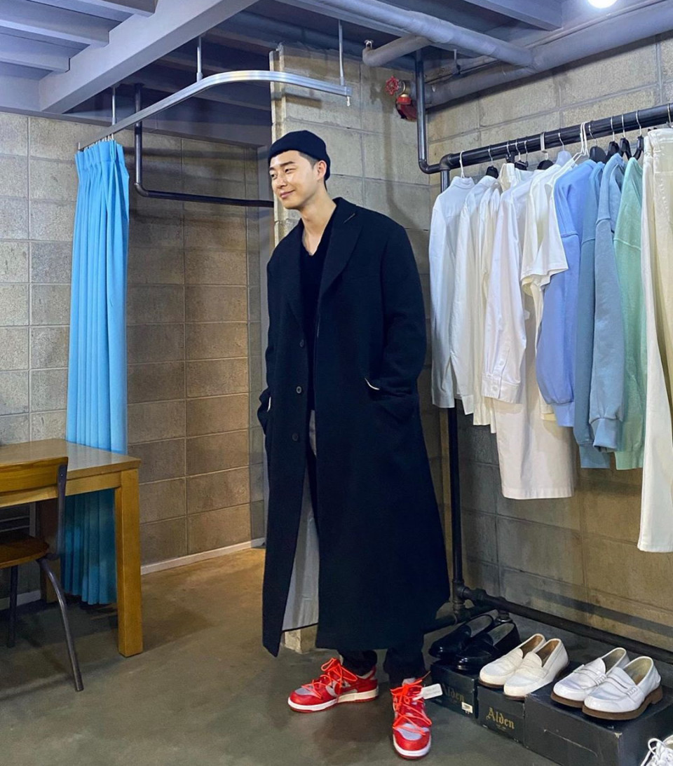 朴敘俊最新公開的照片中,他身穿一件長到腳踝的黑色大衣,全身幾乎都是黑色系的,腳上卻套了雙亮眼的紅色運動鞋。朴敘俊有186公分,這身長版大衣把他的比例又拉長,看看朴敘俊那雙無處安放的大長腿,視覺上看起來都快超過190公分了吧!