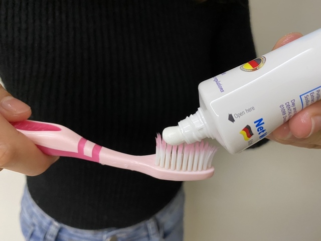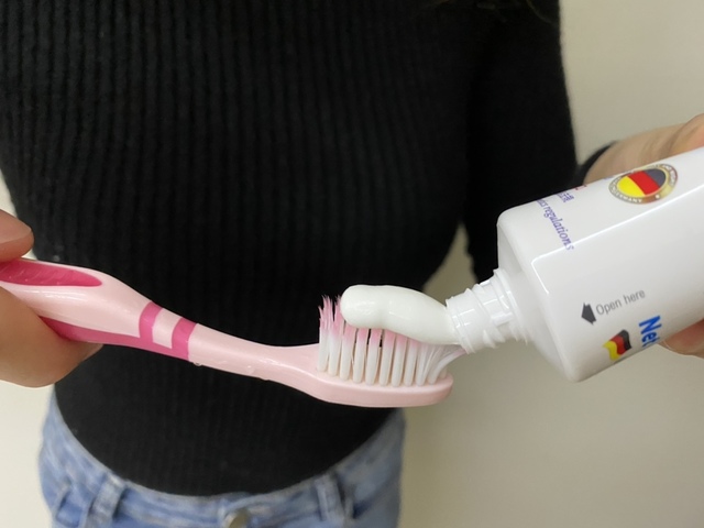 睡覺前使用夜用牙膏,擠的量大概和牙刷刷毛長度一樣就夠了,一樣用正常的清潔步驟,刷牙3-5分鐘