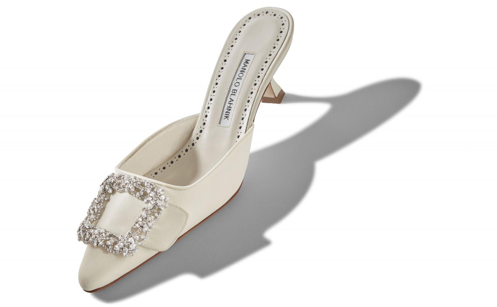 Maysale米白色低跟鞋是Manolo Blahnik經典鞋款,方型的鑽釦於鞋頭上看起來不過份浮誇但仍保有低調的奢華,襯托女強人不輕易屈服的韌性和高貴氣質,實在太適合屋哩(韓文:我們)世莉了!(Maysale米白色方型鑽釦低跟鞋,NT.42,800。)