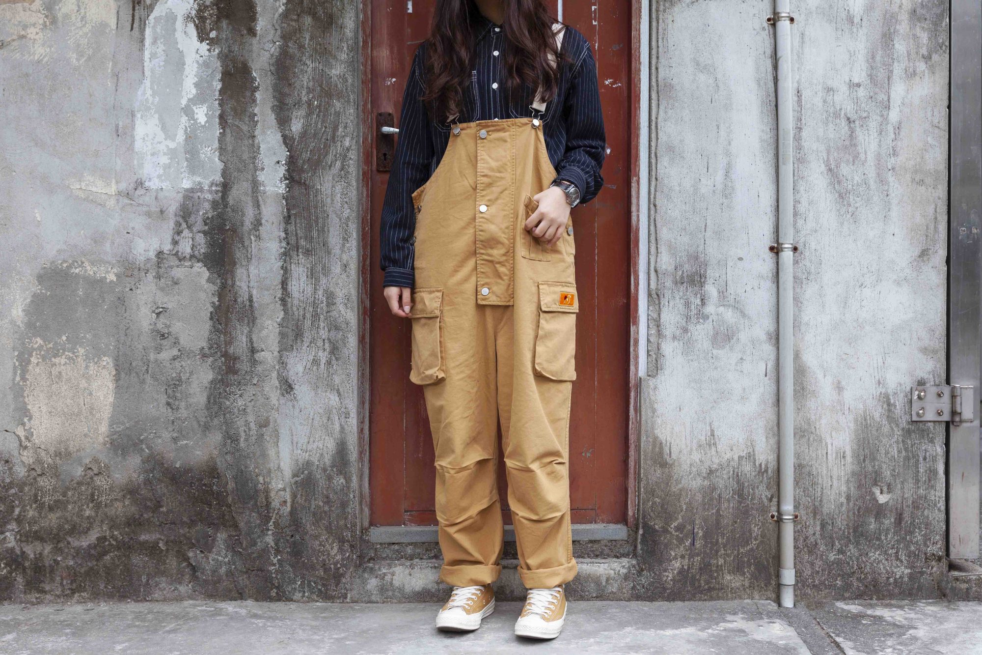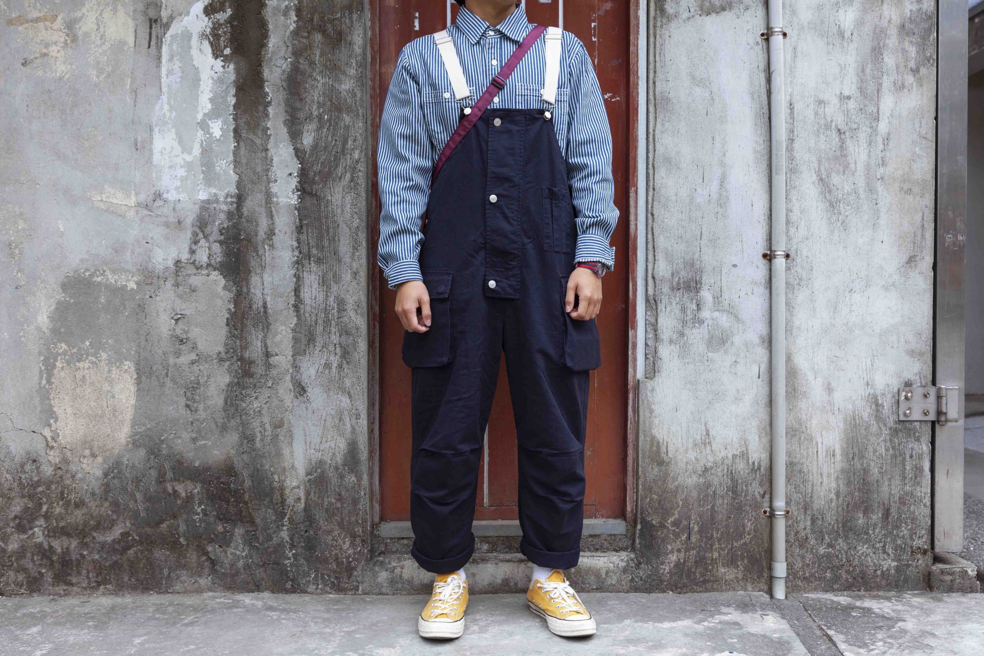 “ 以同款不同色的吊帶褲,搭配復古味道的條紋襯衫,呈現復古工裝的風格,腳上那雙黃色 All Star 與白襪有畫龍點睛之效。