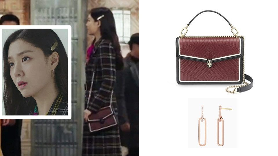 最後一套則是非常符合徐丹地位的貴族優雅風格~因為整體服裝風格彩度較高、色彩多元,所以以暗酒紅色的信封包增加穩重度,而鍊條背帶也能增加穿搭的高級。這套服裝的耳環則以玫瑰金搭配些許鑲鑽,能夠平衡臉部的色彩跟服裝的鮮豔度,長形線條也能拉長臉部的視覺比例,更顯臉小!