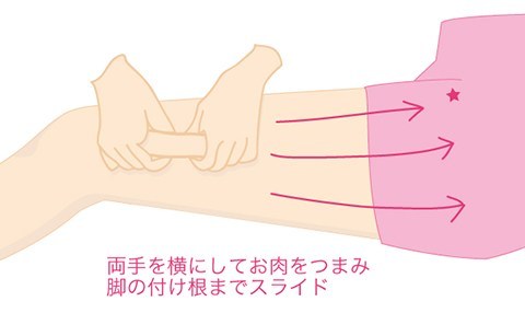 以手指力量捏腿部肌肉,重複幾次再往臀部處由下至上按摩,最後在停在臀部處加強按壓穴道。