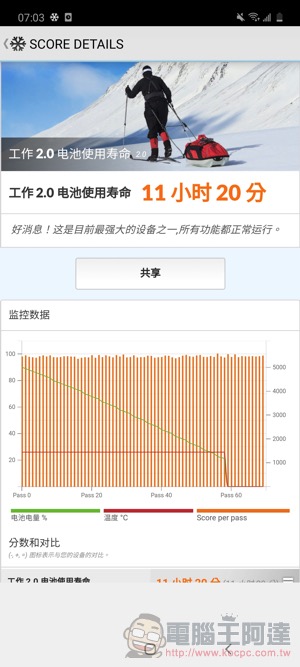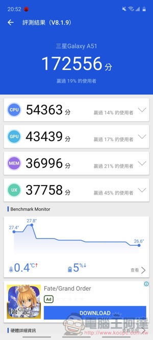 電力方面,Galaxy A51 表現算可圈可點,在 PCMark 工作 2.0 電池壽命得到了 11 小時 20 分的成績。實際使用起來的感覺是比跑出來的成績還要更省電,可能是搭配暗黑模式主題的關係,所以比預期要耐久: