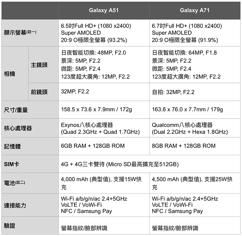 進入效能續航測試之前,我們也先列出 Galaxy A51 與 A71 的重點規格: