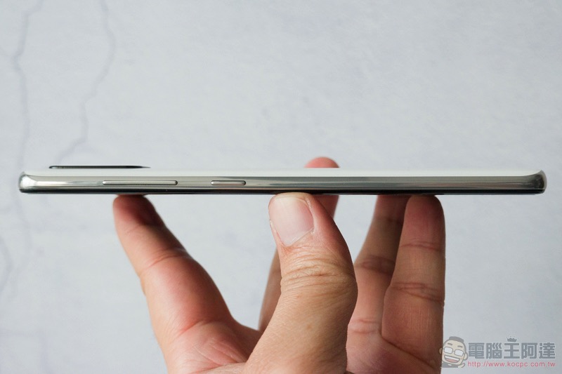 正面的 O 極限全螢幕的特別之處應該不用特別介紹了。挖孔的自拍鏡頭其實對於視覺的影響真的不大,但卻可以將螢幕邊框的存在感有效降低,達到高達 93.2% 的螢幕占比: